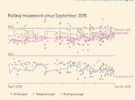 Since the tragic murder of British MP Jo Cox last week, just a week before the Brexit referendum of June 23, the already very tight polls that had been edging towards Brexit, suddenly reversed and showed a majority for Bremain. On the night before the referendum, The Financial Times Brexit poll tracker showed a 48% - 46% Bremain majority.